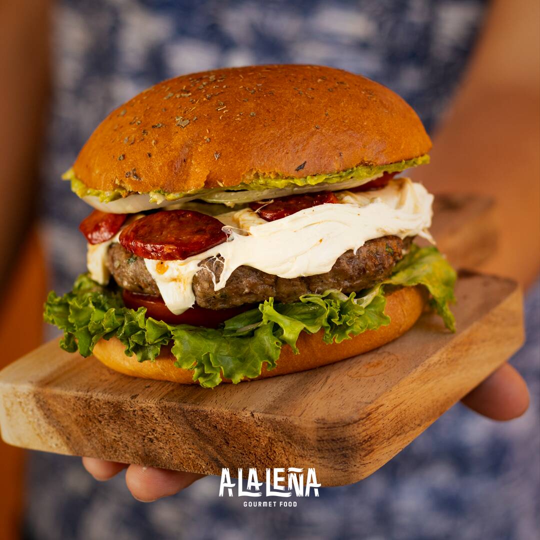 Pan brioche, 200 gr. de sirloin, chorizo, aderezo de la casa, queso de hebra, guacamole, chicharrón, tocino, lechuga, tomate, cebolla. Incluye 100 gr. de papas fritas.