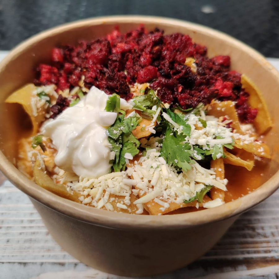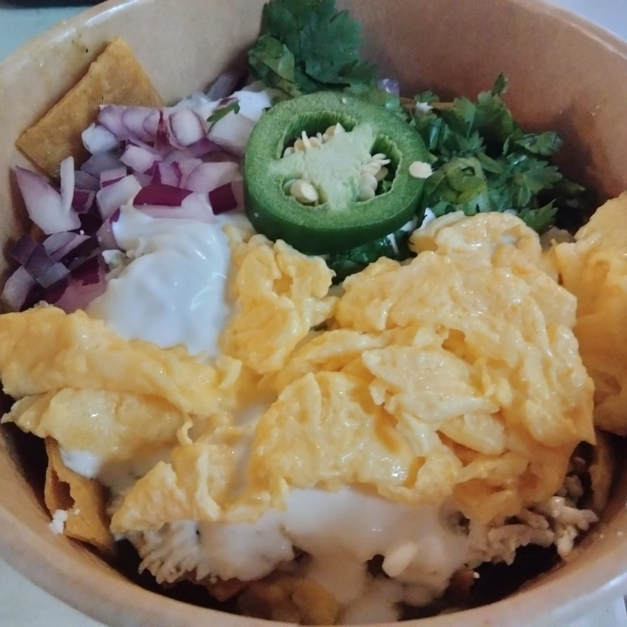 TOTOPO/HUEVO REVUELTO/SALSA/QUESO/CREMA/CEBOLLA/CILANTRO