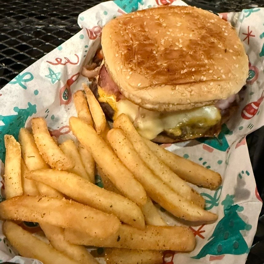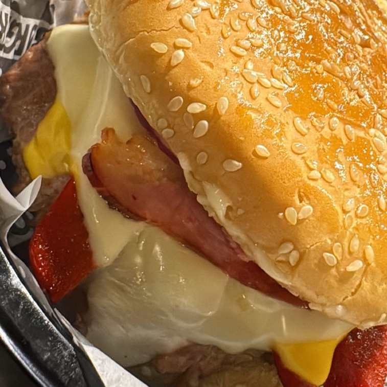 Hamburguesa con carne de 100% de res, tocino, rajas de jalapeño, catsup, mayonesa y quesos (amarillo y blanco manchego).