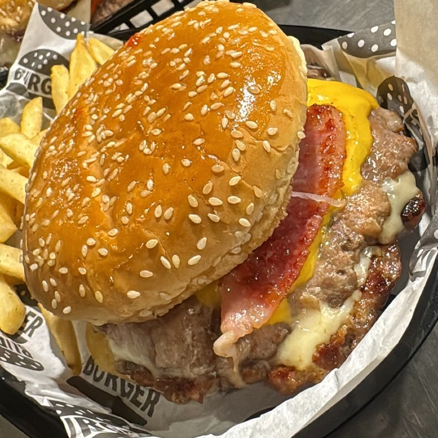 Hamburguesa con DOBLE carne de 100% de res, tocino, rajas de jalapeño, catsup, mayonesa y quesos (amarillo y blanco manchego).
