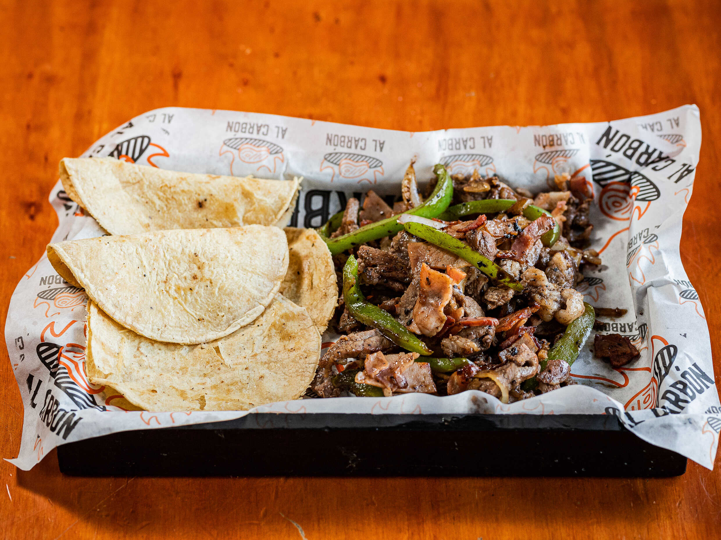 Fajitas asadas con cebolla, pimientos, jamòn y tocino.