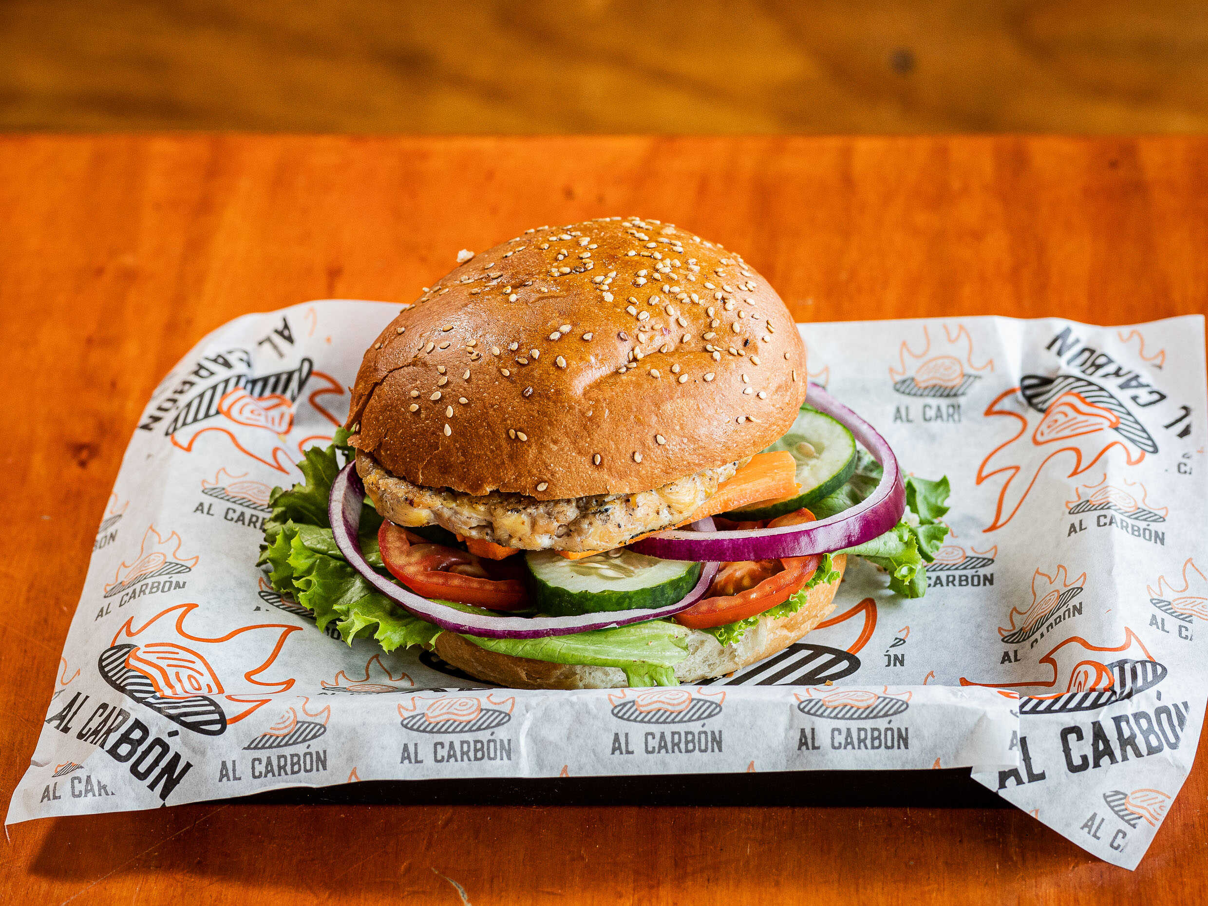 Hamburguesa 100% pechuga de pollo a la parrilla sobre una cama de vegetales frescos, queso crema y aderezo Bluecheese.
