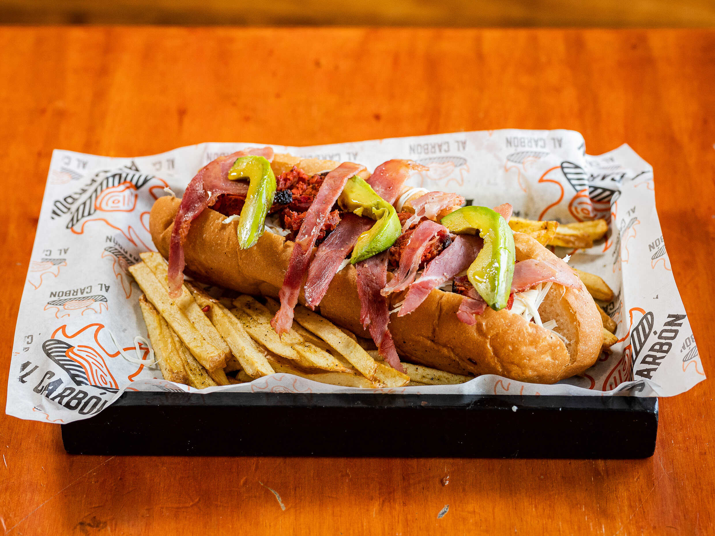 Salchicha de pavo JUMBO,tocino, jamòn, chorizo, queso de hebra, aguacate * Incluye papas