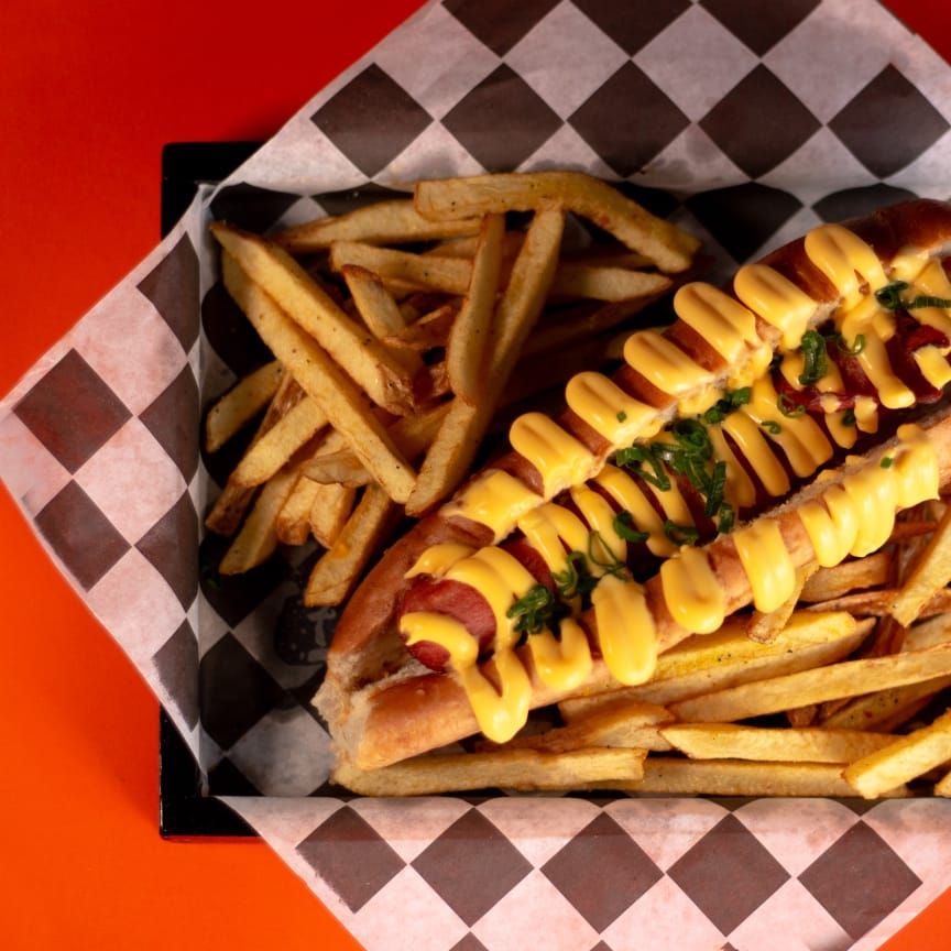 Salchicha de pavo JUMBO bañada con queso cheddar, tocino frito y cebollin * Incluye papas