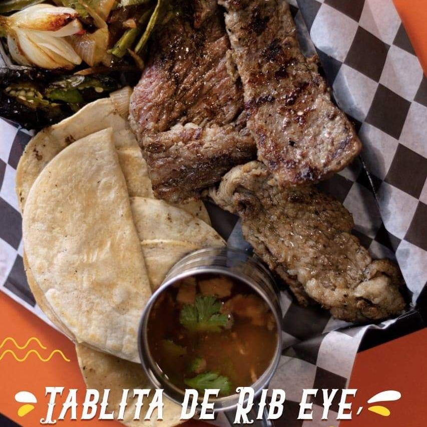 300grs. de Rib Eye, frijoles charros, nopal, cebollin, quesadilla y tortillas