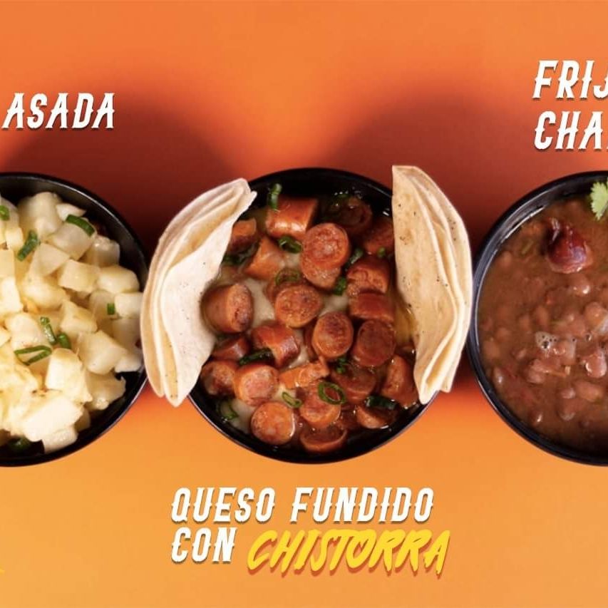 Mezcla de embutidos a la parrilla (400grs) Ch. Argentino, Ch. Español, Chistorra, Salchicha asadera, acompañados con frijoles charros, nopal, cebollin, quesadilla y tortillas
