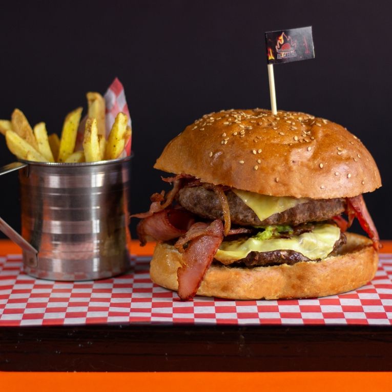 Hamburguesa 100% carne al doble con todo el sazón de la parrilla al carbón, queso y tocino. Incluye papitas.