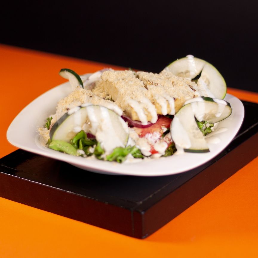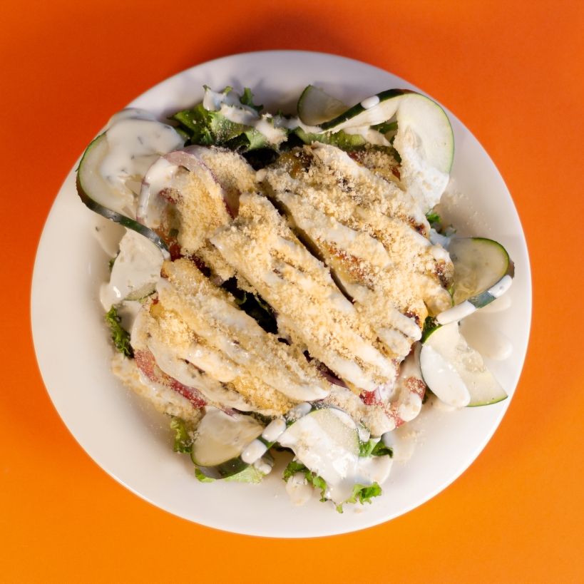 Base de Lechugas, Tomate, Pepino ,Cebolla morada, Pollo empanizado y aderezo al gusto.