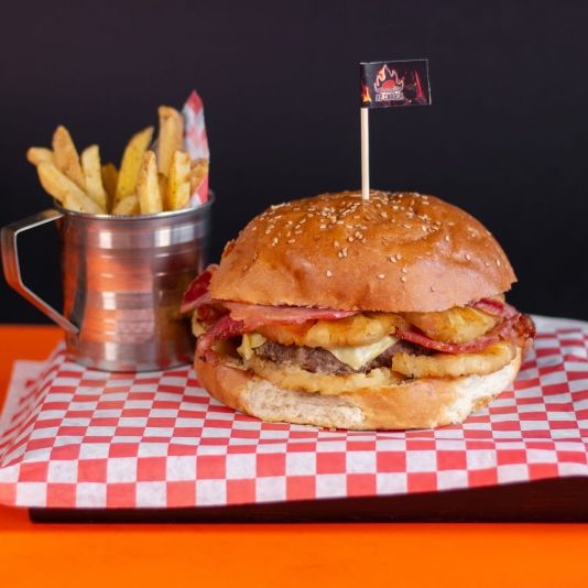 Hamburguesa 100% carne con todo el sazón de la parrilla al carbón, queso, jamón y piña a la parrilla