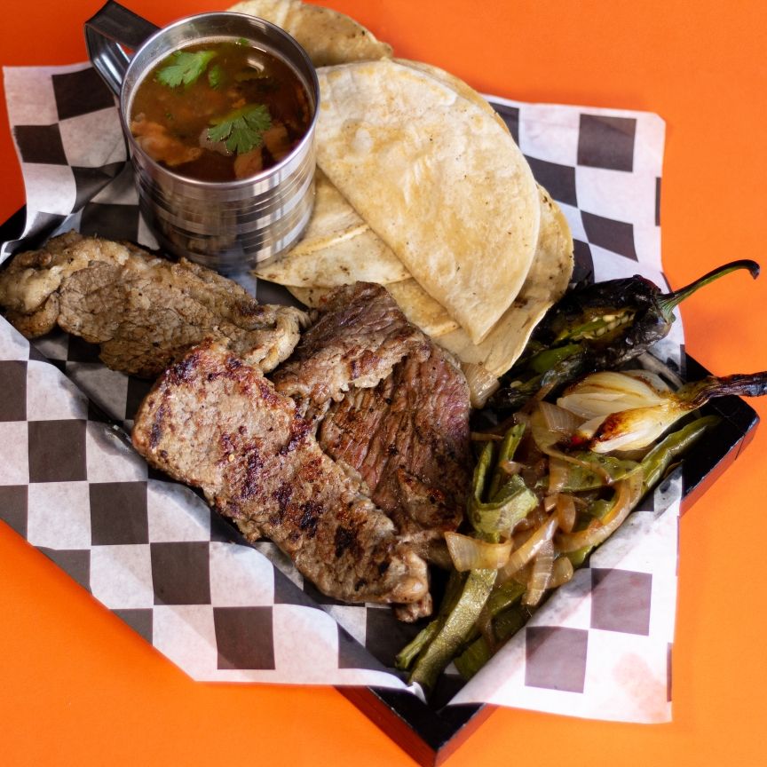 300grs. de Arrachera incluye frijoles charros, nopal, quesadilla y tortillas