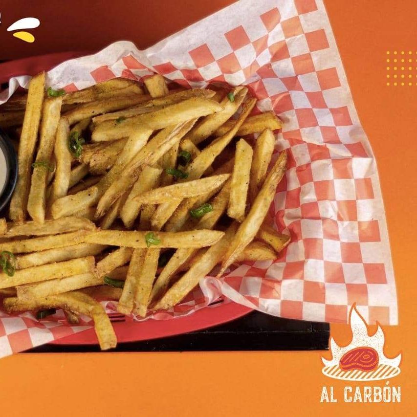 Hamburguesa 100% carne con todo el sazón de la parrilla al carbón, queso, tocino frito y cebollita asada., Acompañada de una porción de itas a la francesa