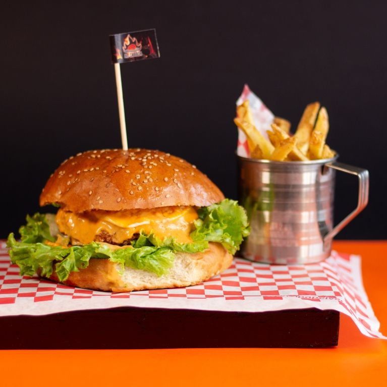 Hamburguesa de pollo con crujiente empanizado aderezada con salsa Búfalo, Tocino , cebollita caramelizada y un toque de Ranch.