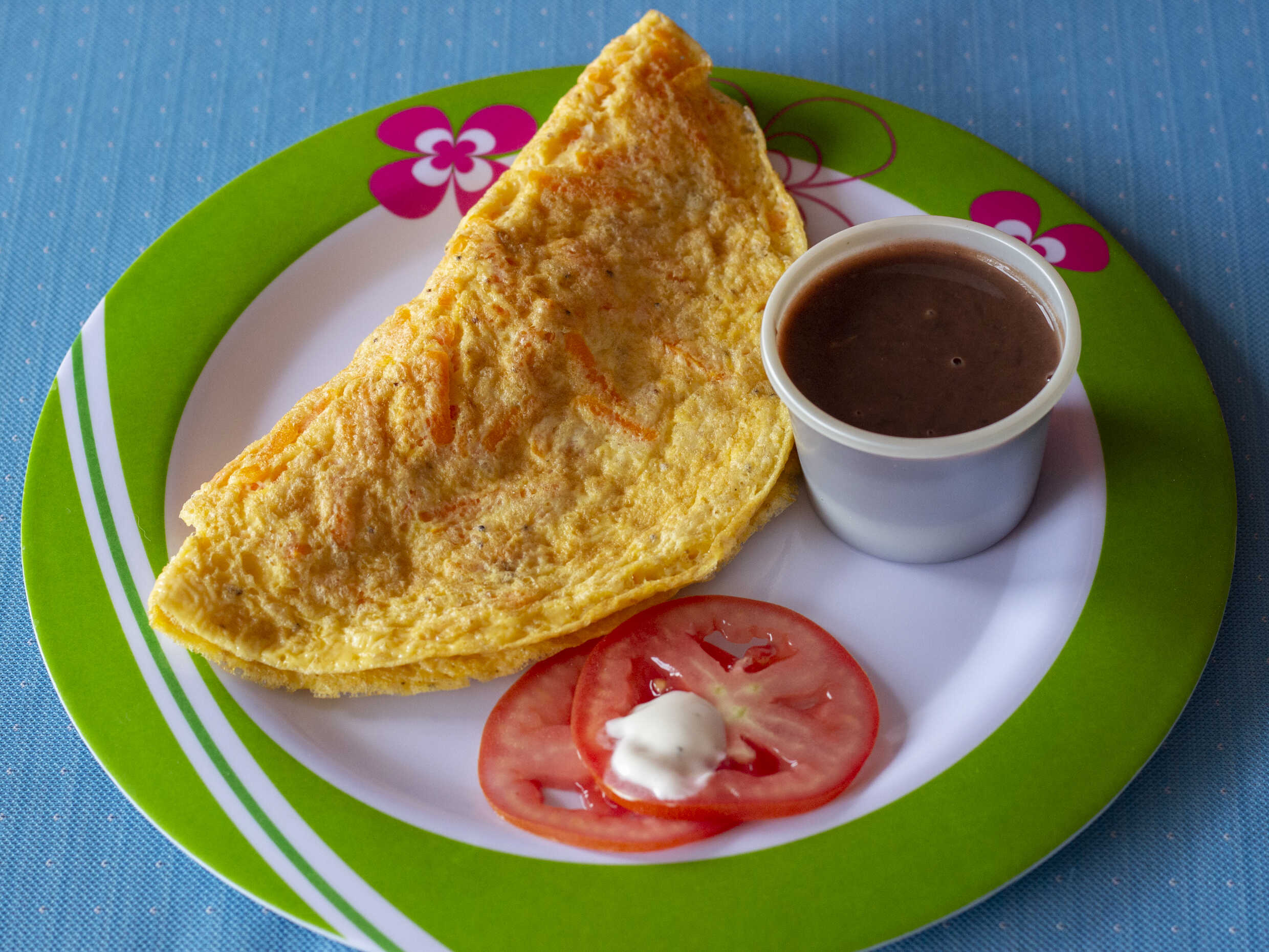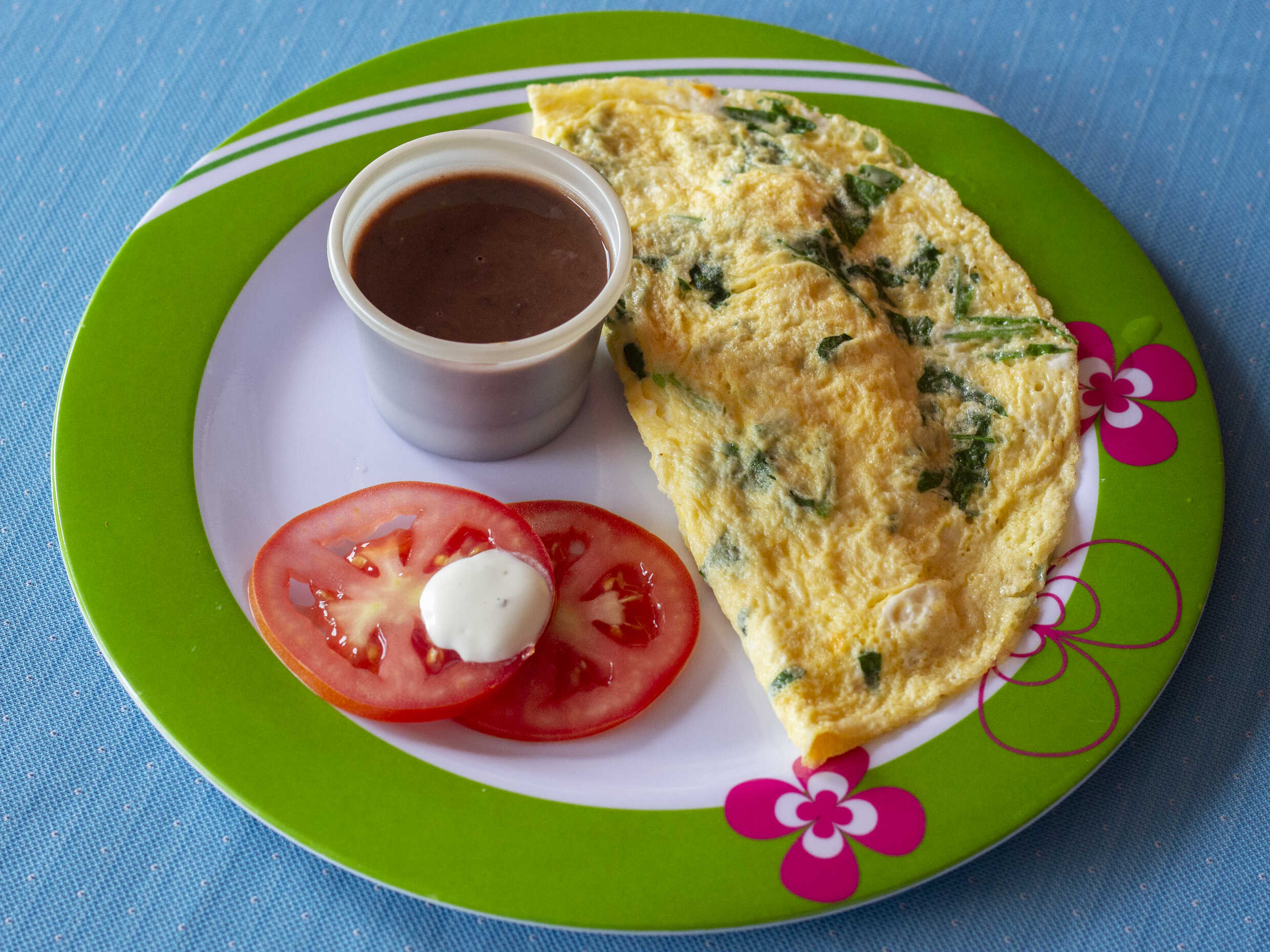 3 pzas de huevos estilo tortilla con espinacas y rellenas de queso, acompañados con tomate en rodajas de frijoles y tortillas