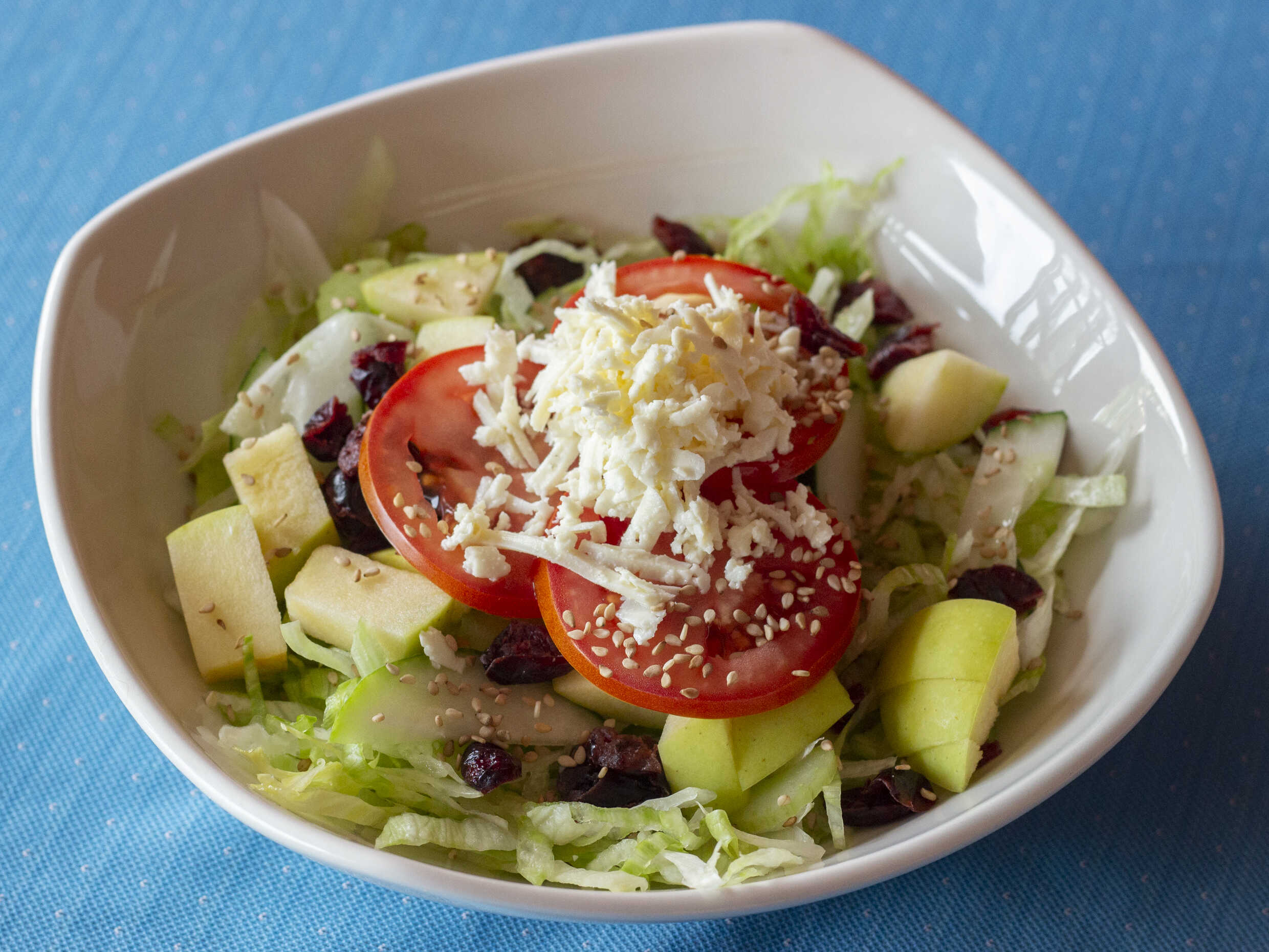 Ensalada d elchuga, tomate, pepino, apio picados con queso y ajonolí, acompñado de aderezo ranch