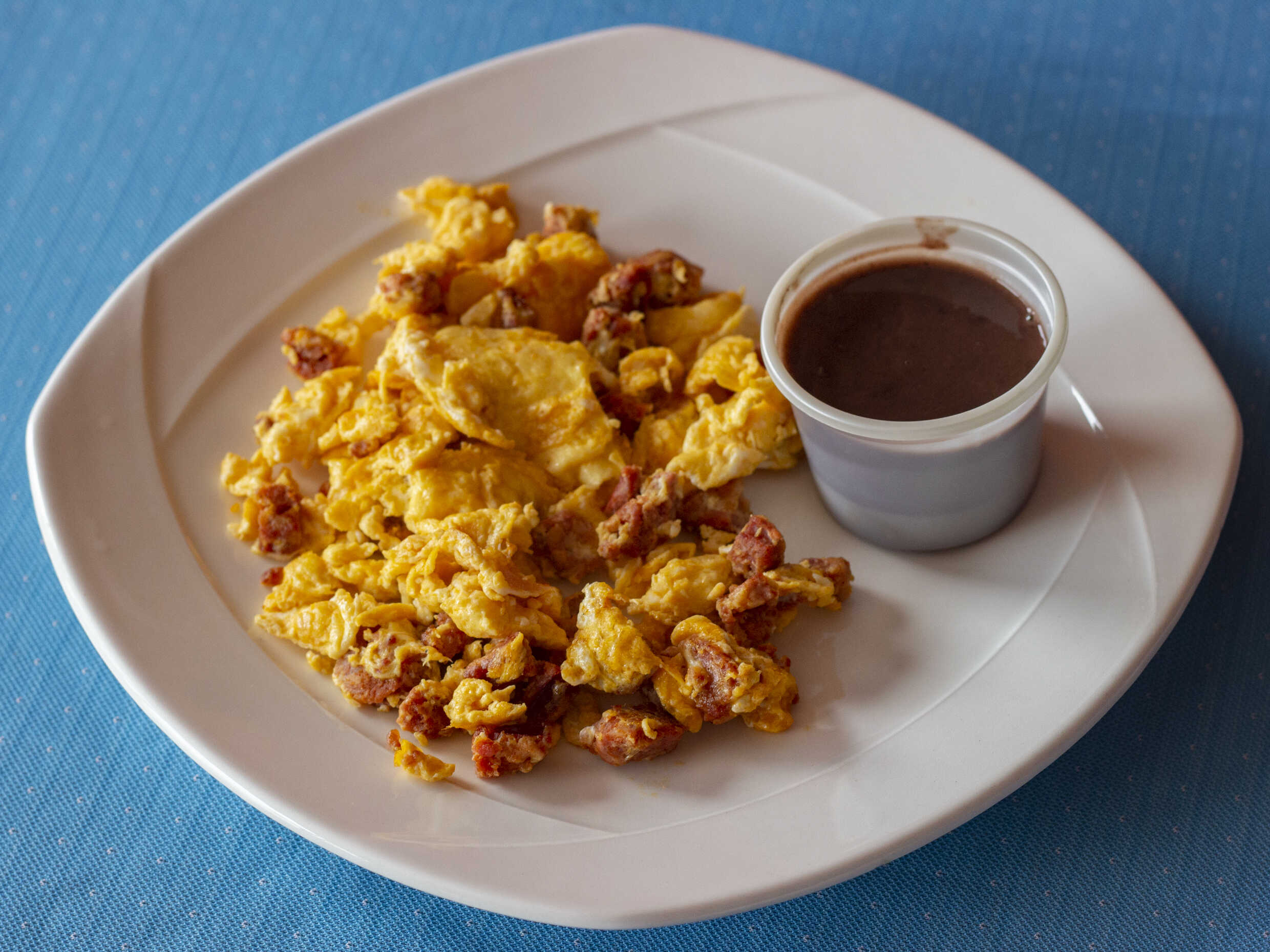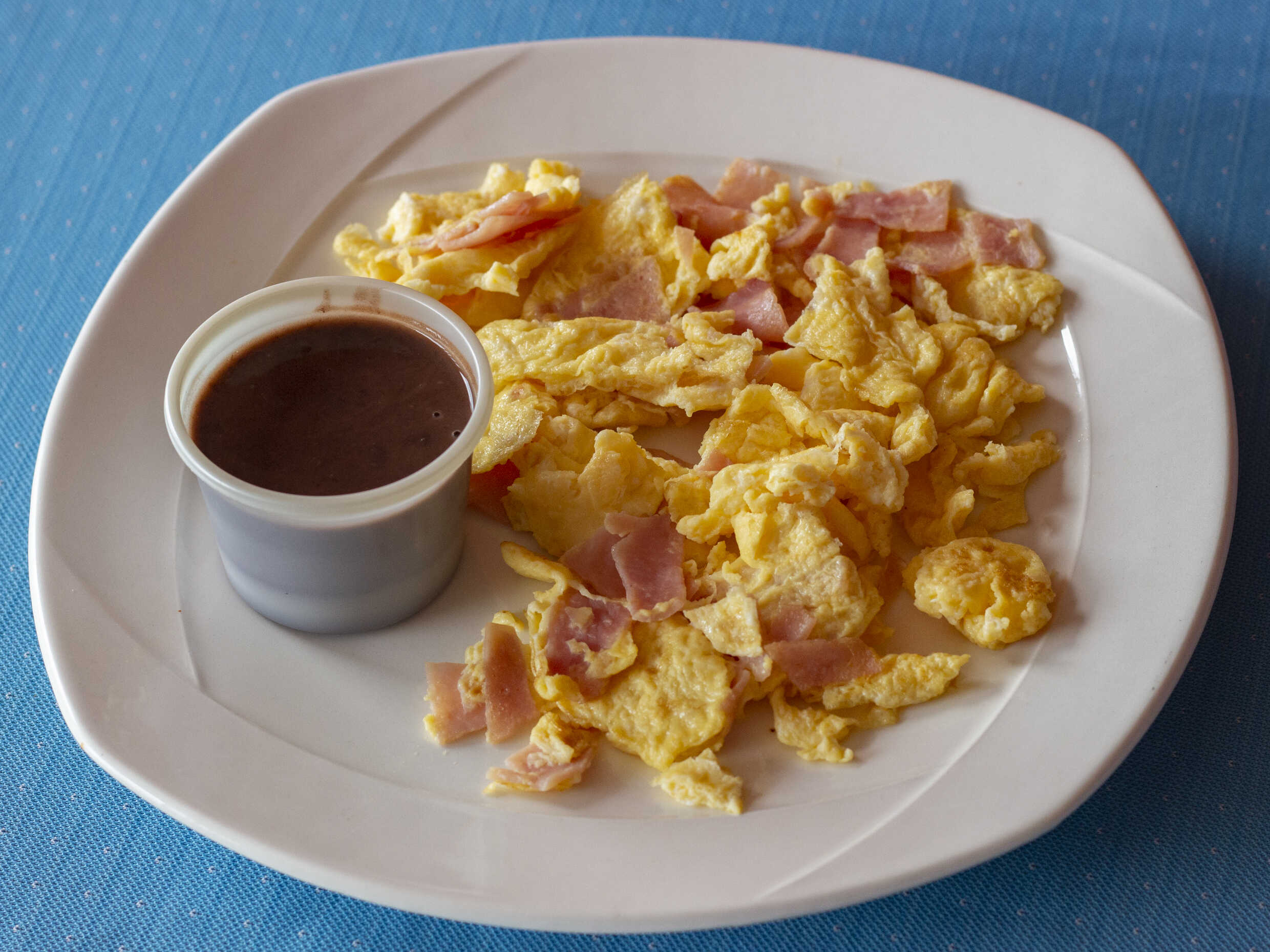huevos revueltos (3pzas) revueltos on jamón de pavo, acompañados con frijoles y tortillas.