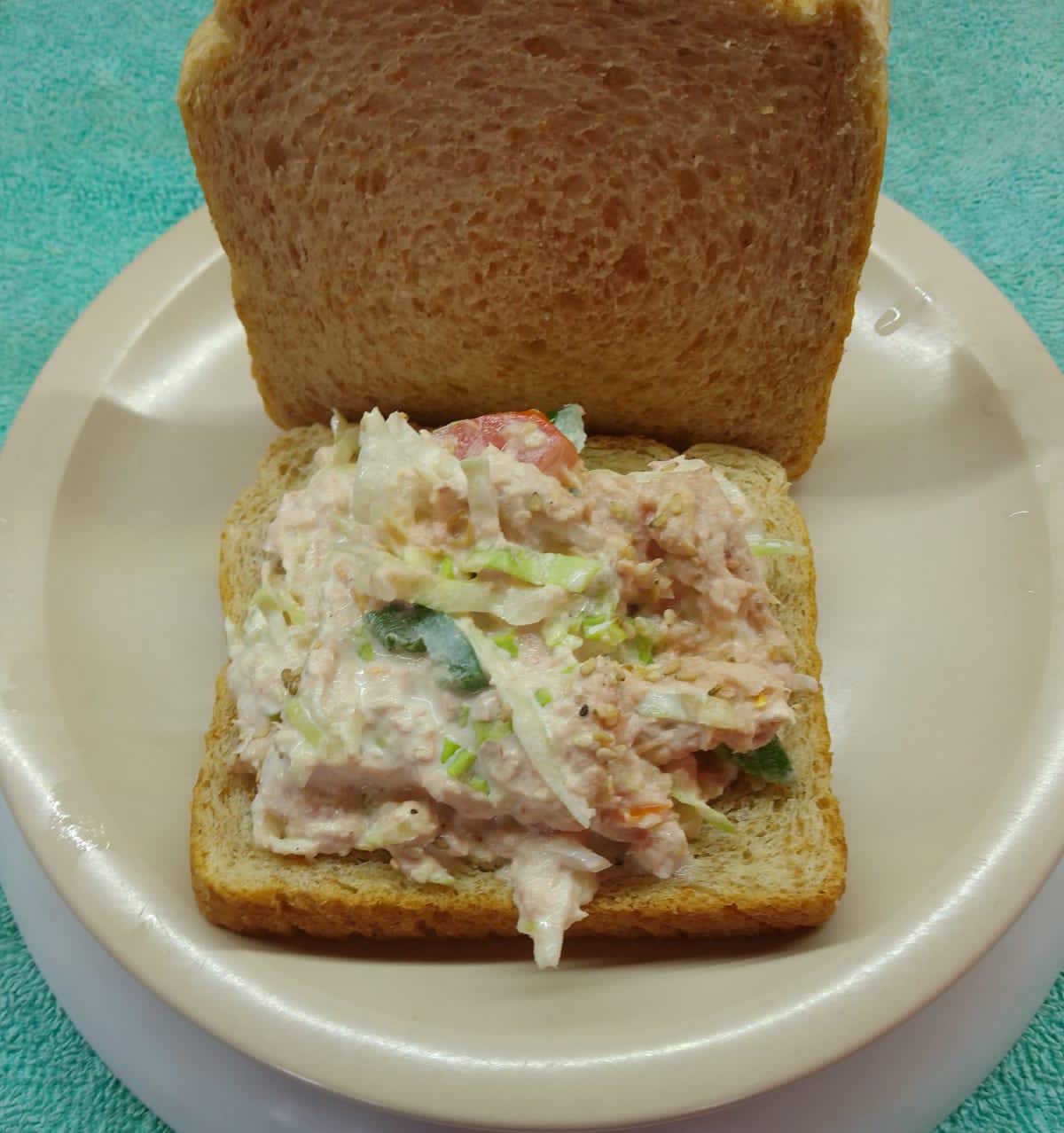 sandwich de pan integral, con atún de agua, mayonesa, lechuga, tomate picado.