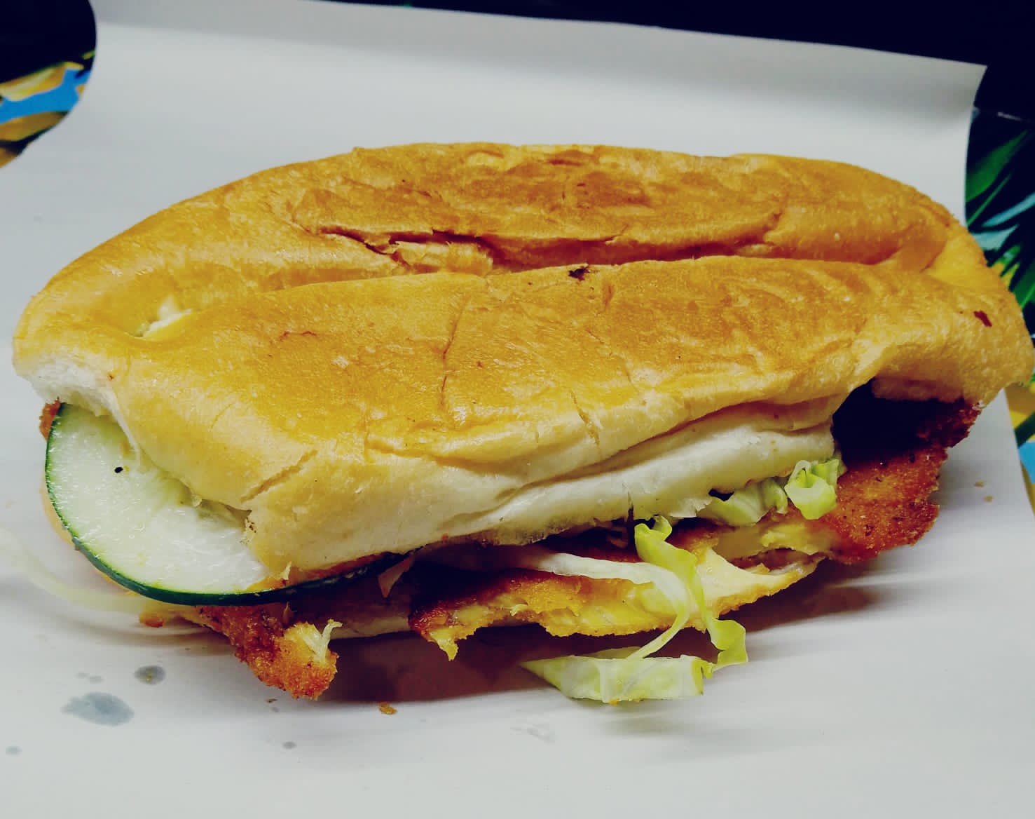 Torta calentada, con mayonesa, pechuga asada, tomate, lechuga y pepino, picante a gustosto