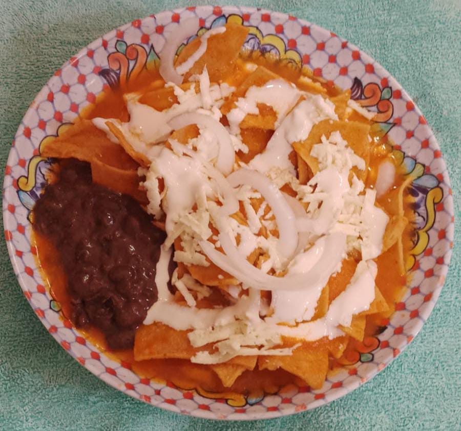 Totopos guisados en salsa de tomate con pollo guisado, cebolla, queso y crema, acompañados de frijoles