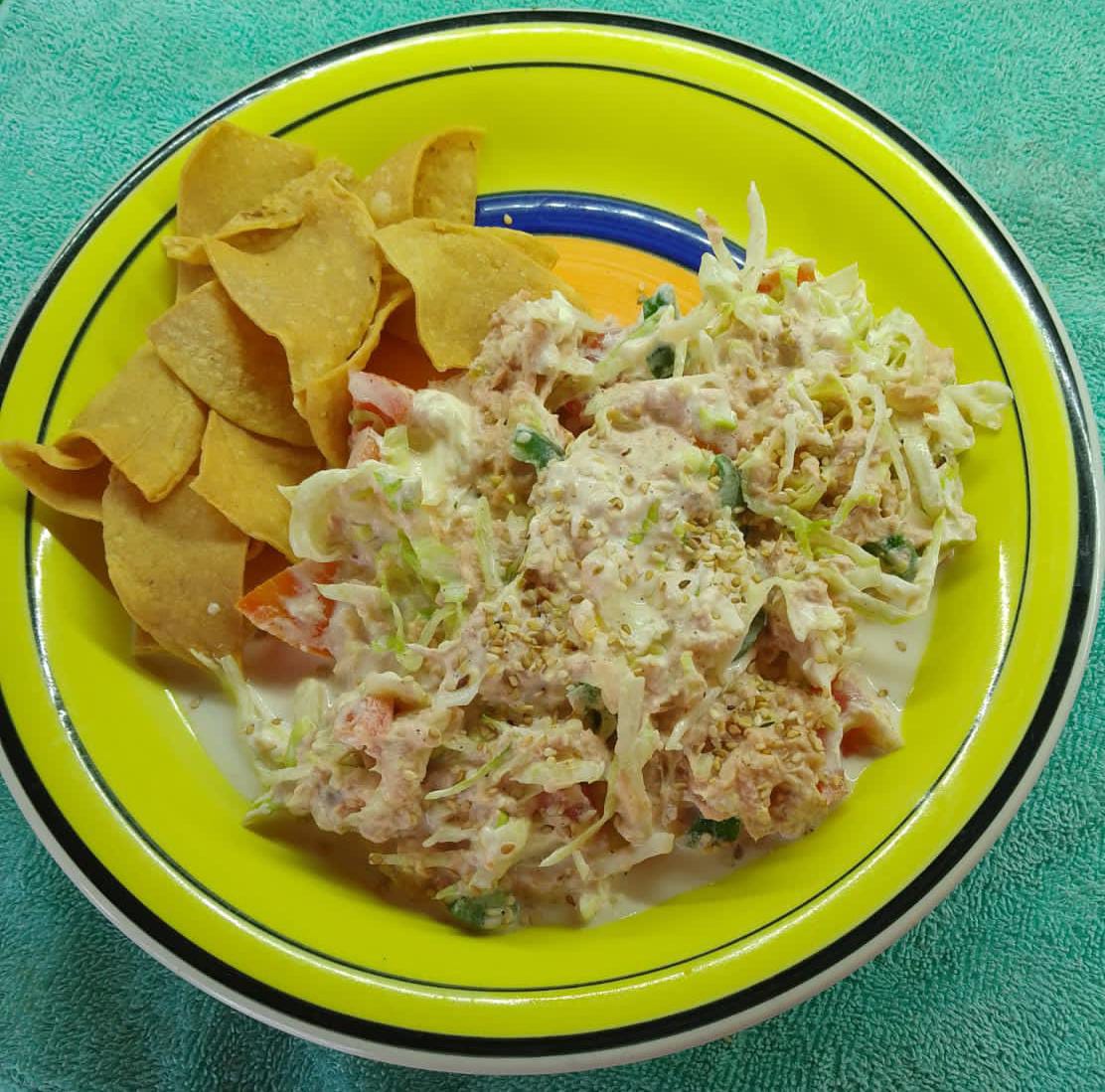 atùn de agua revuelto con lechuga, pepino, tomate, chile jalapeño, mayonesa, aderezo ranch,ajonjolí, acompañado de totopos