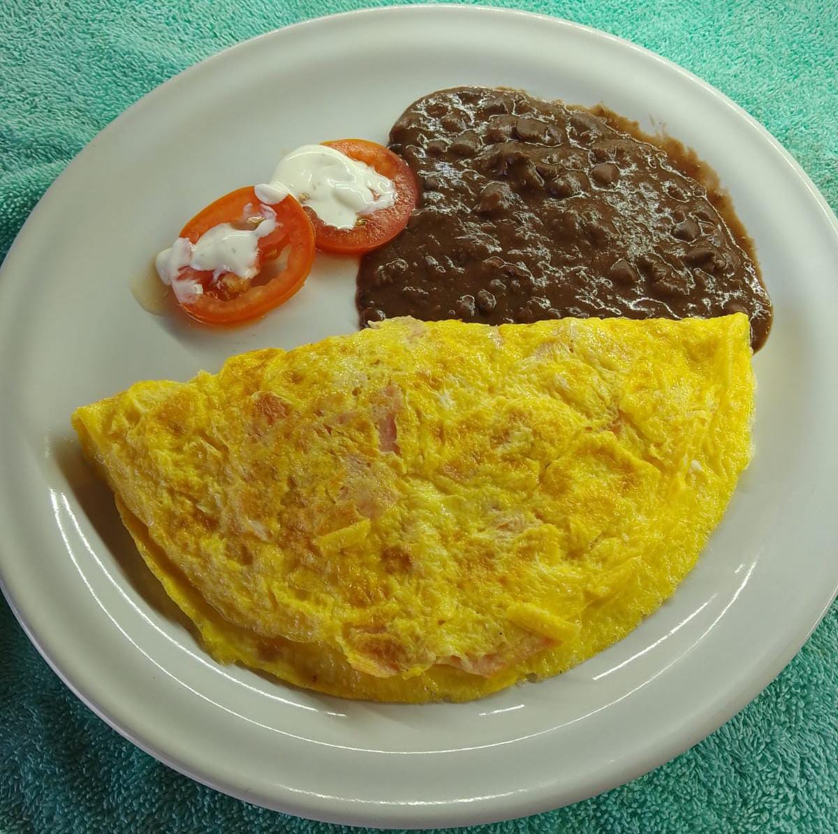 3 piezas de huevos estilo tortilla, con jamon y rellena de queso, acompañado de tomate en rodajas y frijoles y tortillas