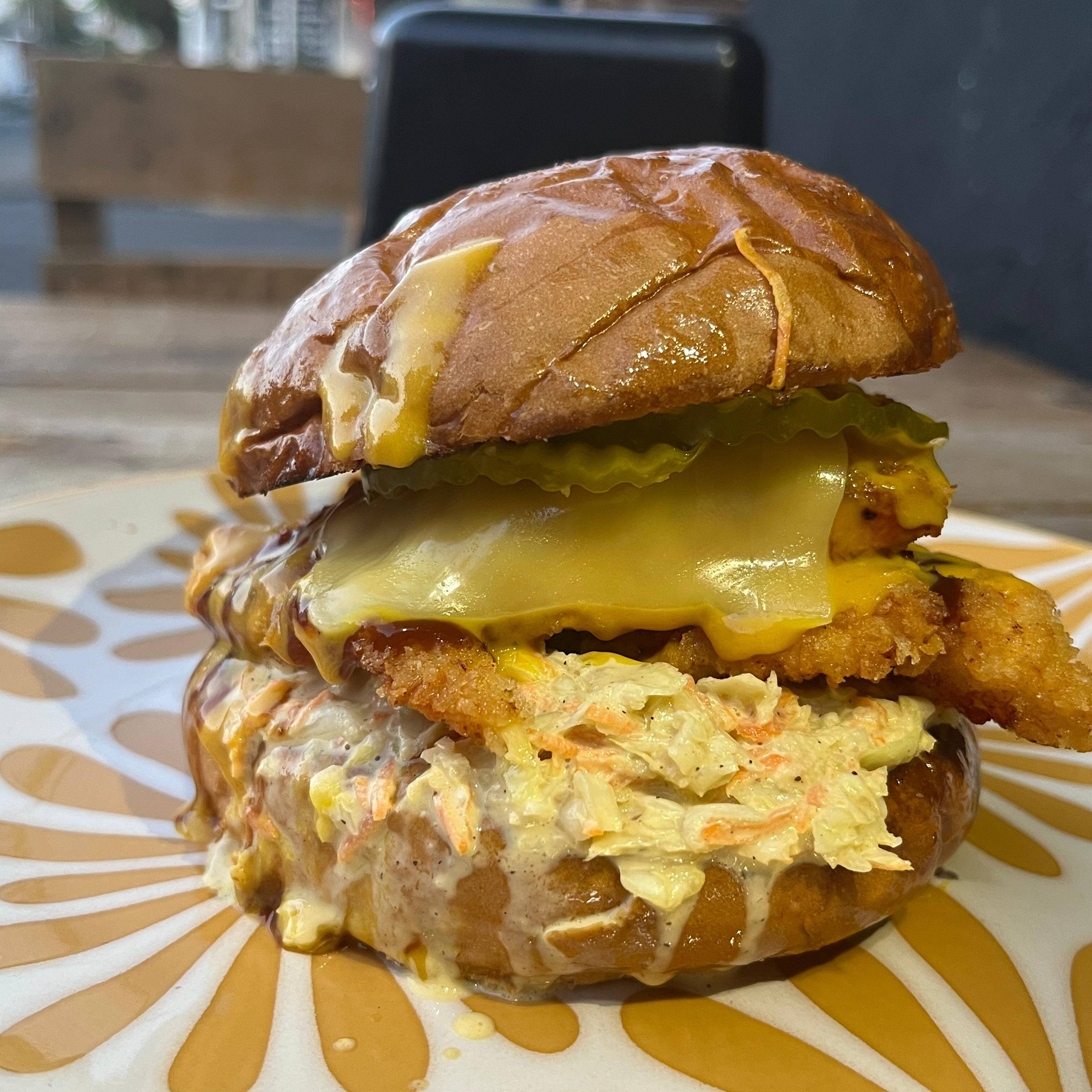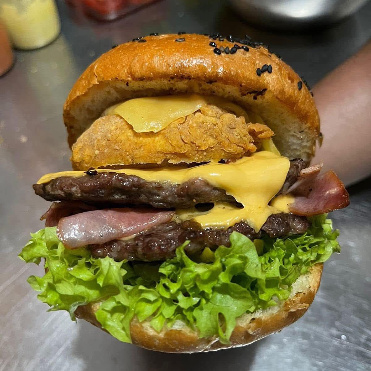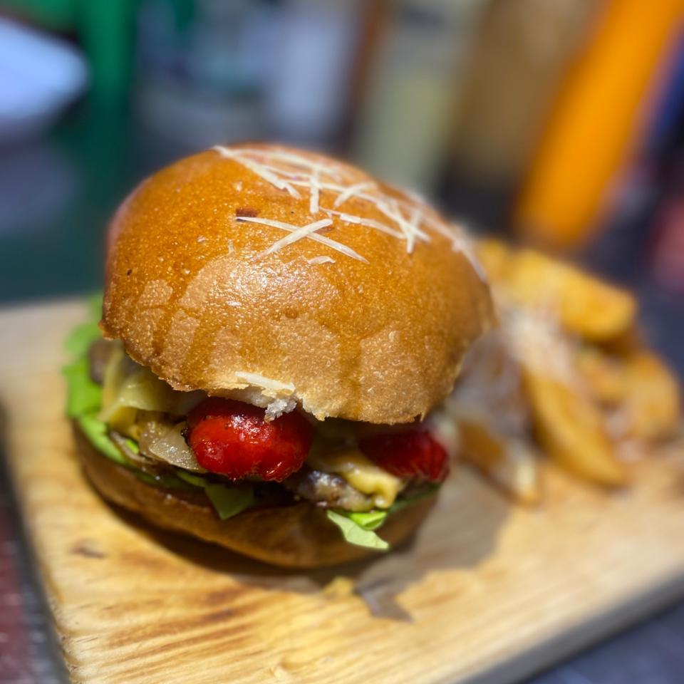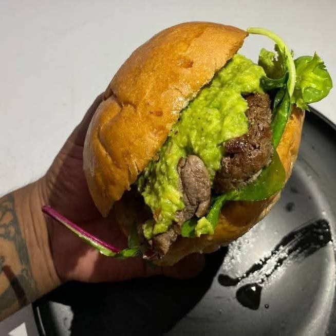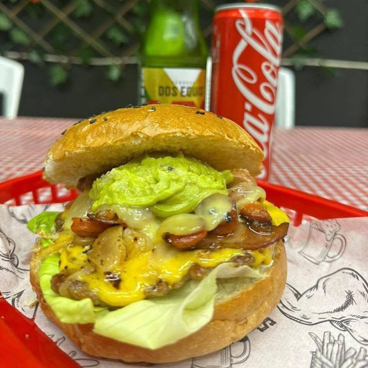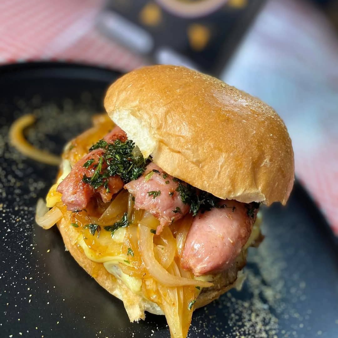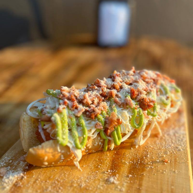 Salchicha de res, ranch, queso cheddar, captsu, mostaza, cebolla caramelizada, queso gratinado, tocino, chistorra y guacamole