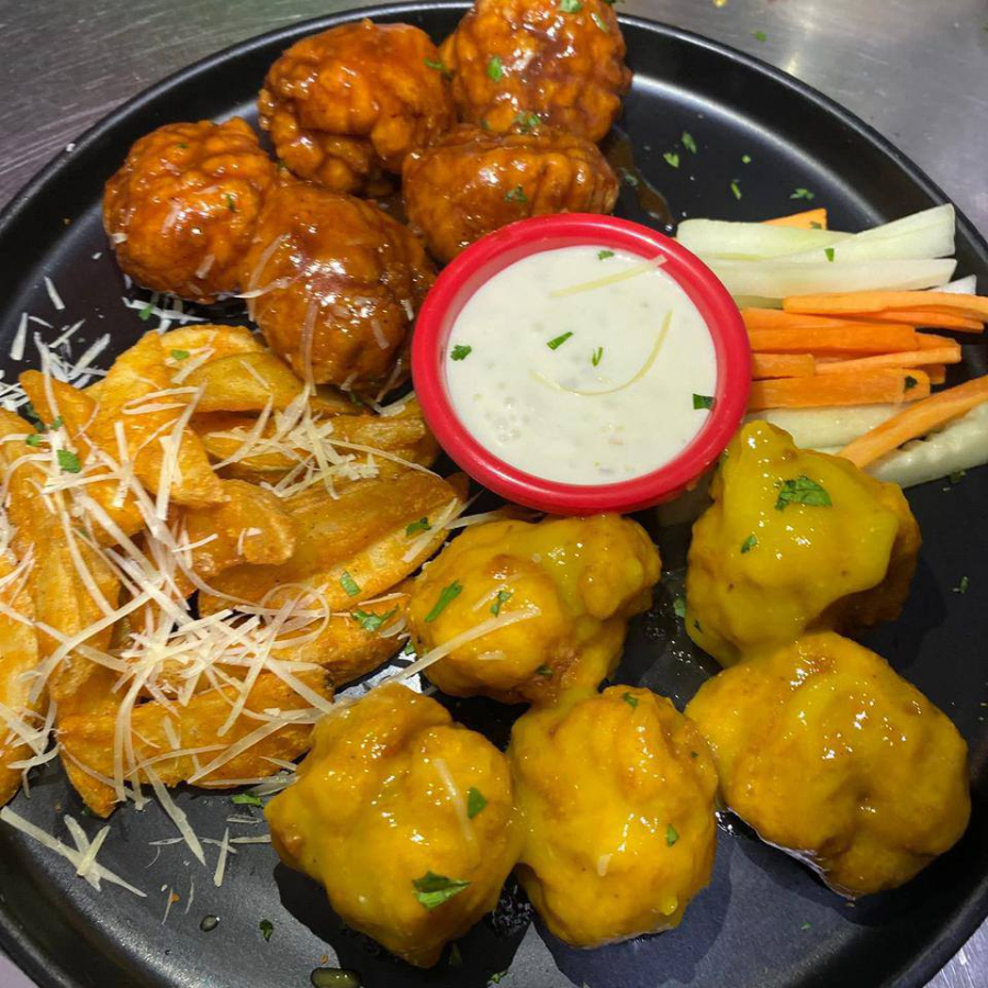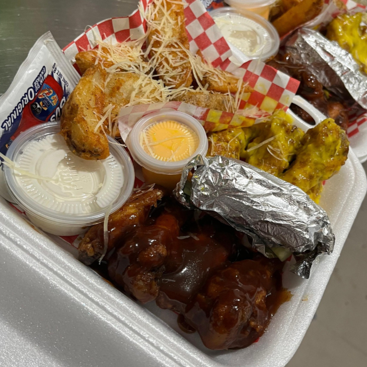 Alitas del dia 2 salsas a elegir con 200g de papas gajo aderezos y vegetales
