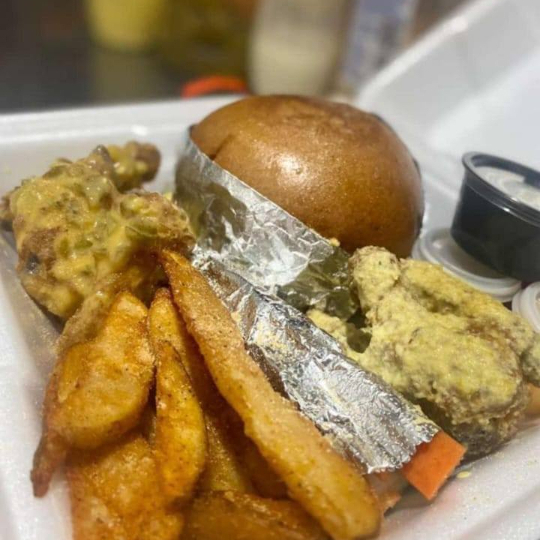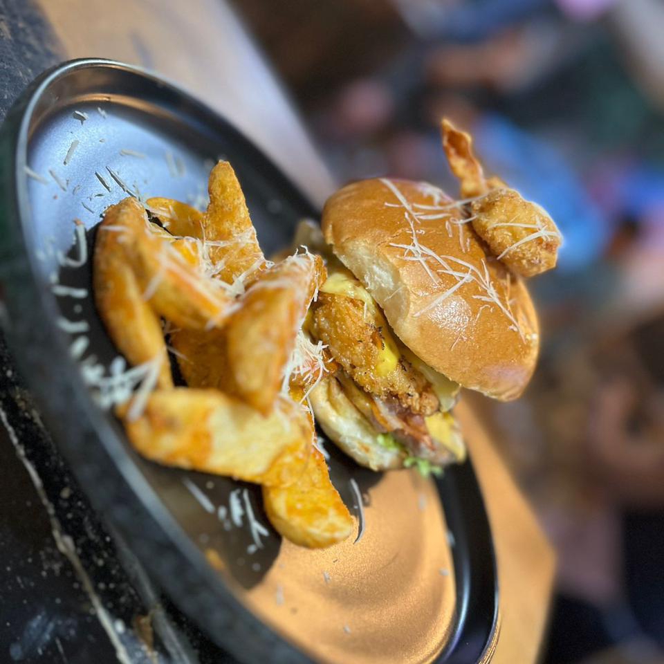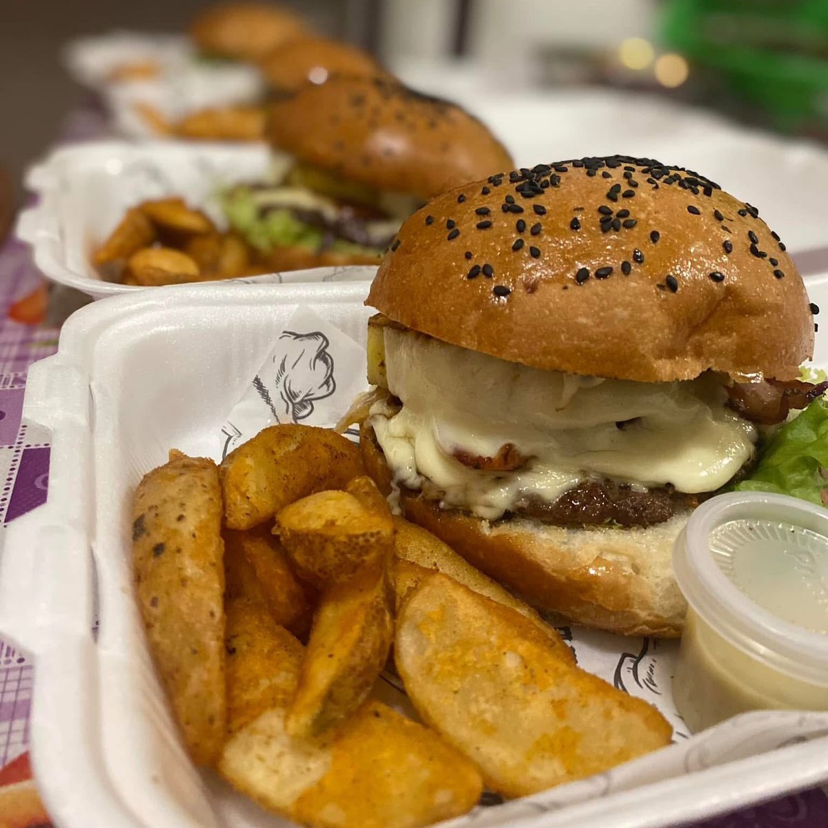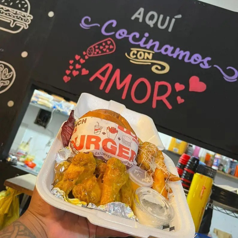 1 Hamburguesa + papas + 5 alitas, 1 salsa a elegir + 1 refresco 355
