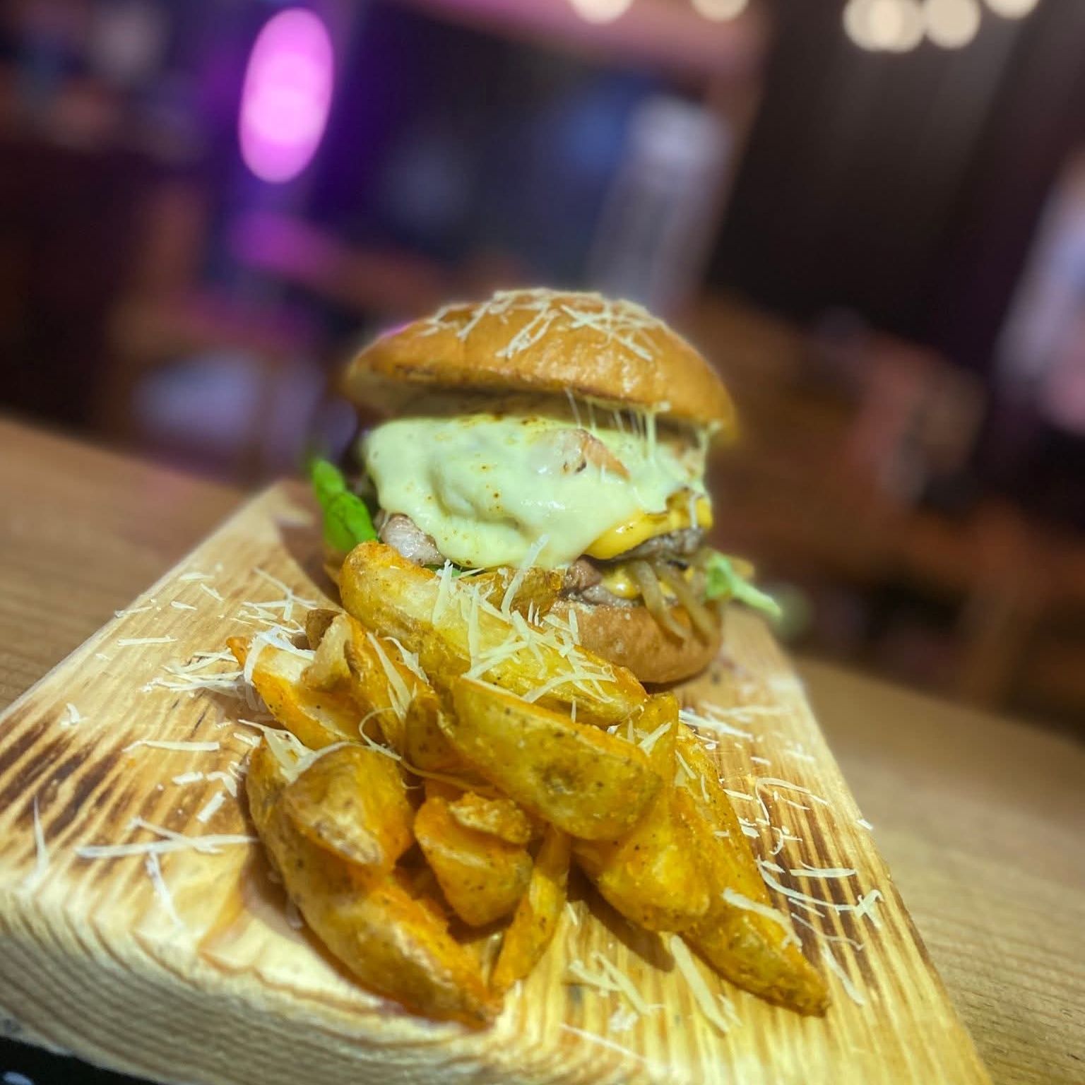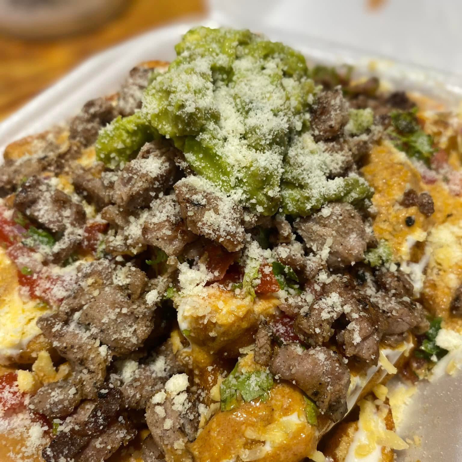 300 gramos de papa gajo, aderezado con ranch y queso cheddar, pico de gallo, arrachera angus, parmesano y pico de gallo
