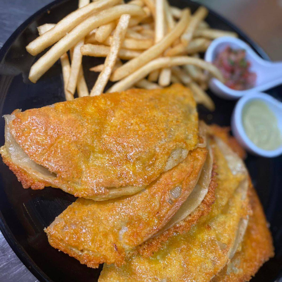 4 piezas de tortillas de arina rellena de chistorra, gouda y cebolla con costra de queso + 200 papas francesa, guacamole y pico de gallo + 1 refresco 355