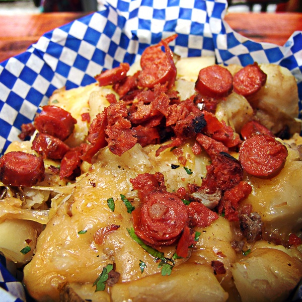 300 gramos de papa gajo, ranch, queso cheddar con chistorra, tocino o salchicha para asar