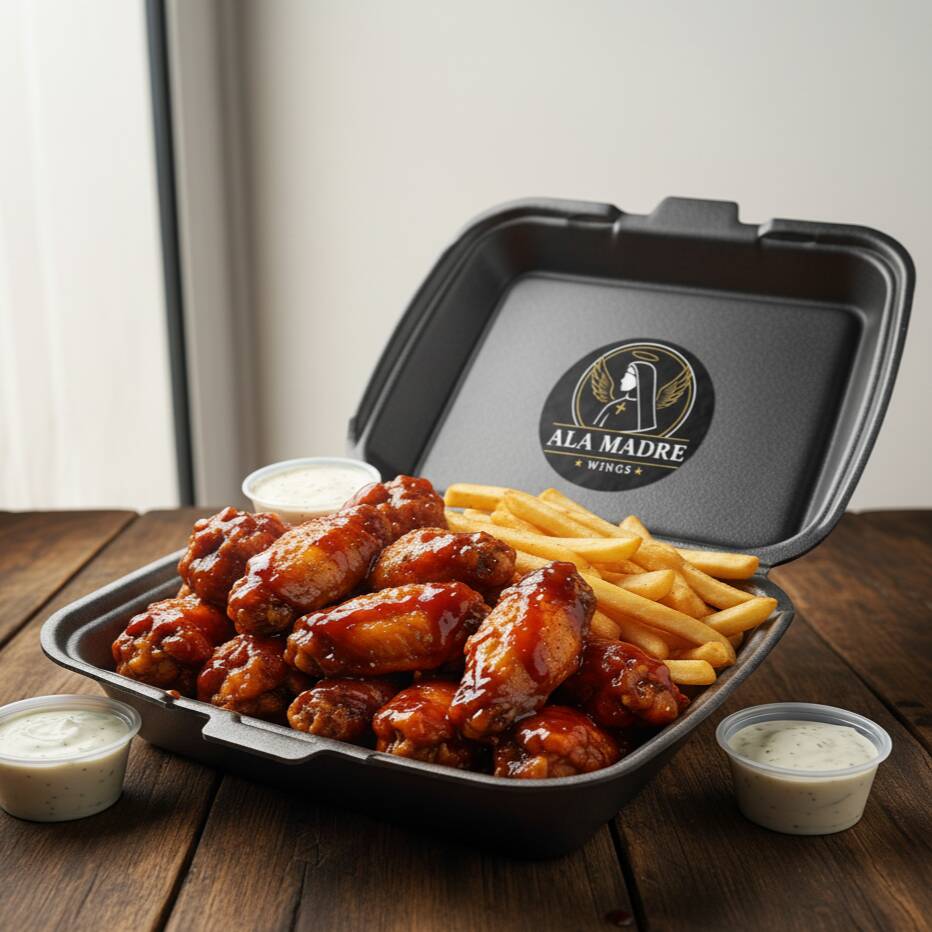 500 g de alitas (7–9 piezas) bien doradas, con 160 g de papas crujientes, 1 aderezo y 2 salsas a elegir. Ideal para el alma solitaria que busca redención con una cerveza.