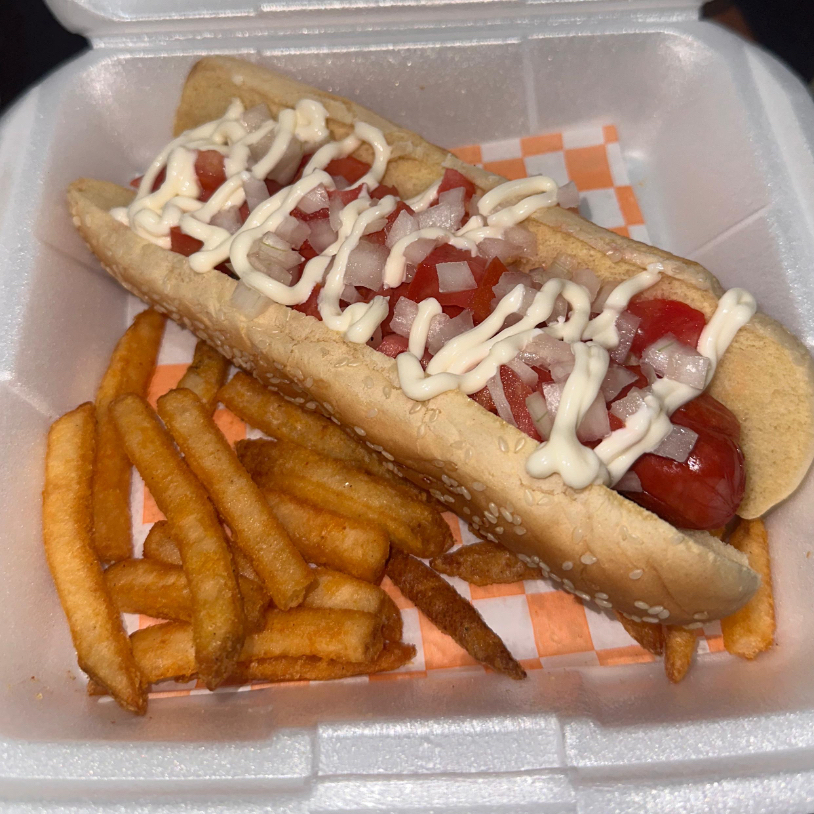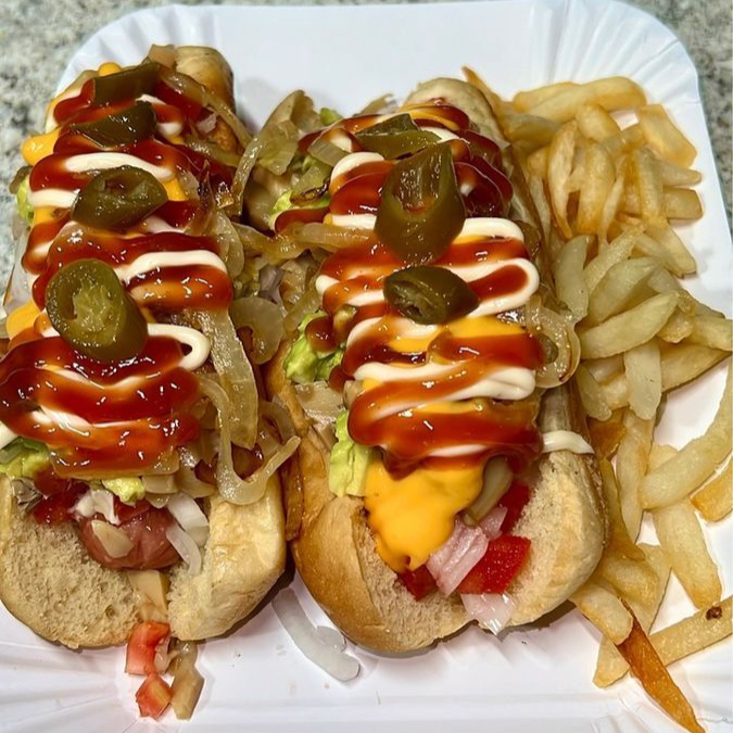 Pan, salchicha de res jumbo, piña, jamón, aderezos, vegetales. Acompañado de 100 gramos de papas a la francesa