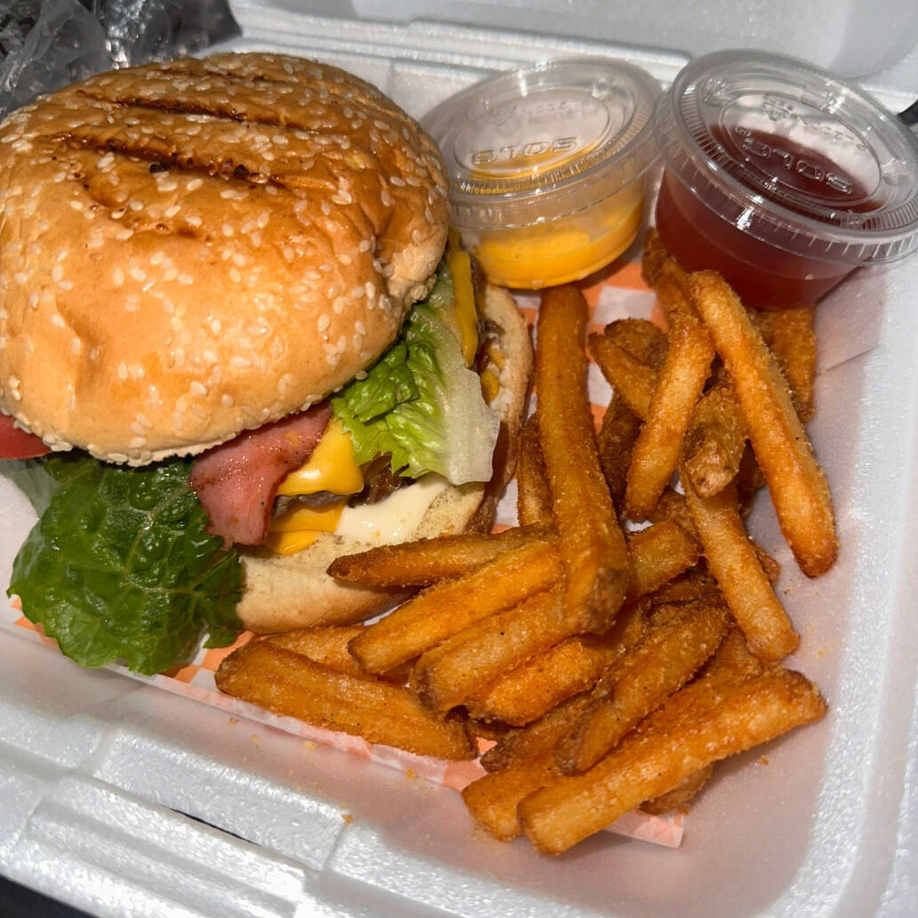 Pan, carne 100% res, tocino, queso americano, aderezo, vegetales, cebolla caramelizada. Acompañada de 100 gramos de papas a la francesa