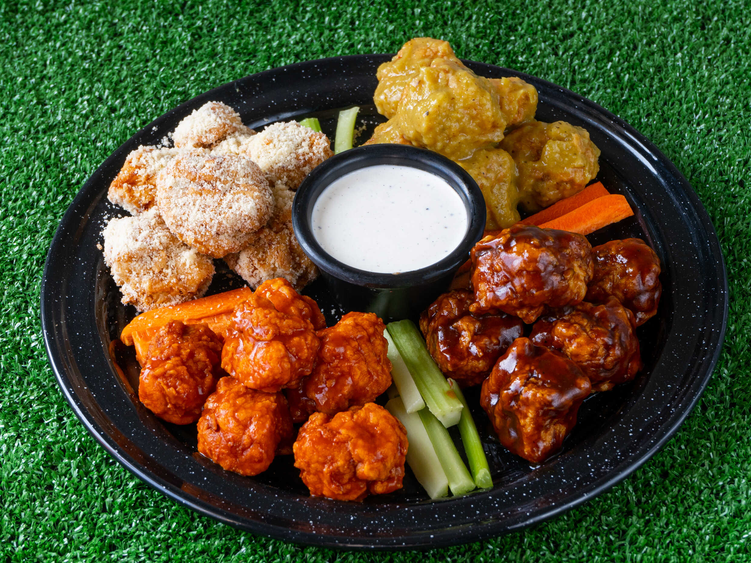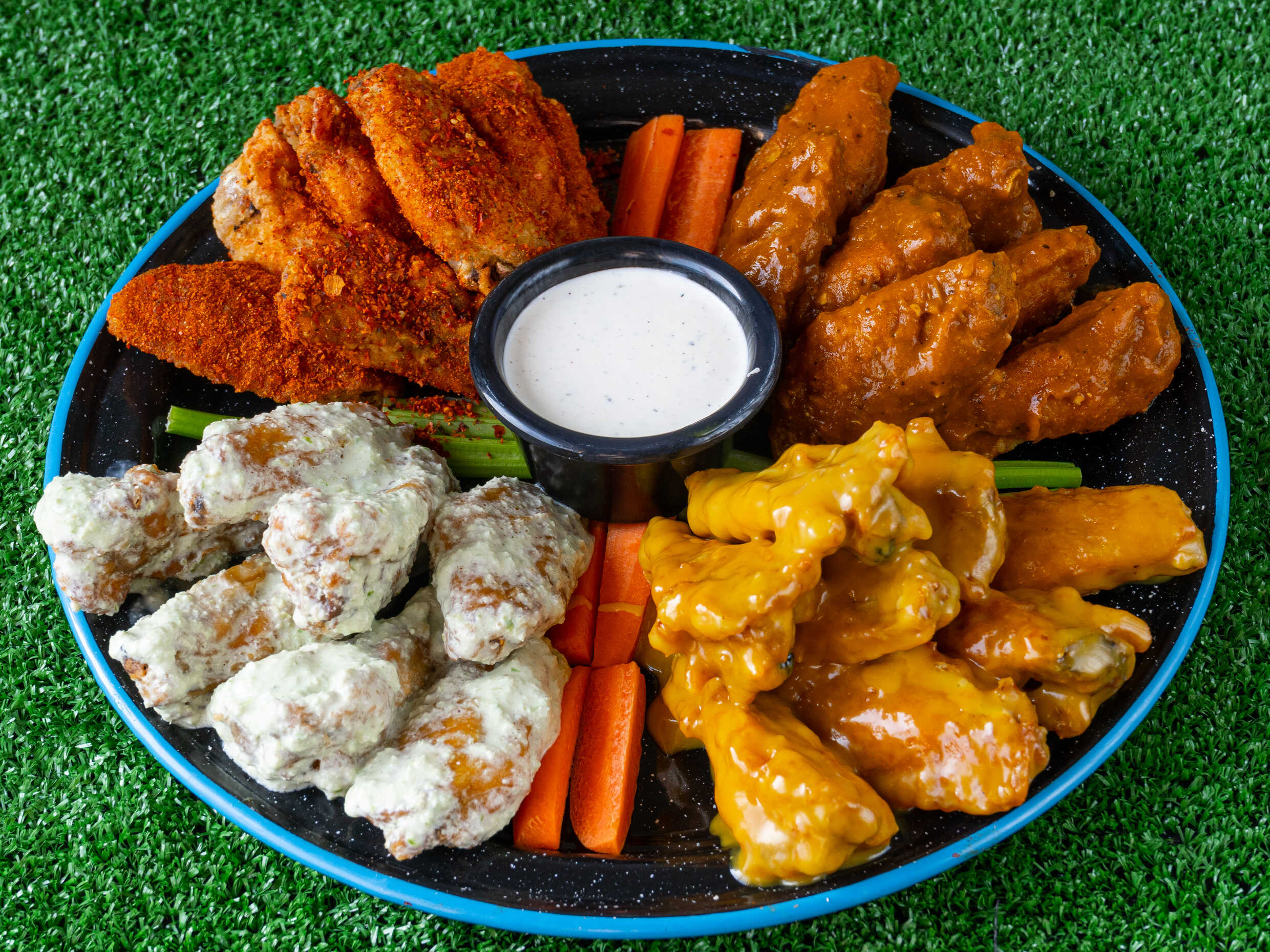 (3 Salsas a elegir) Picosas: habanero, BBQ hot, chile seco, cacahuate, chipotle, piña habanero, buffalo jalapeño, buffalo, honey hot. Saladas: Limón pepper, ajo parmesano. Dulces: BBQ, honey mustard. Incluye un aderezo de ranch.