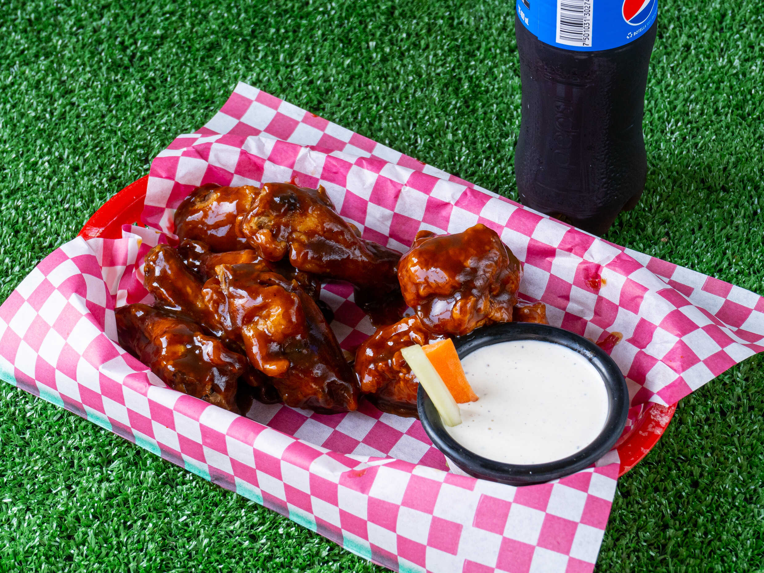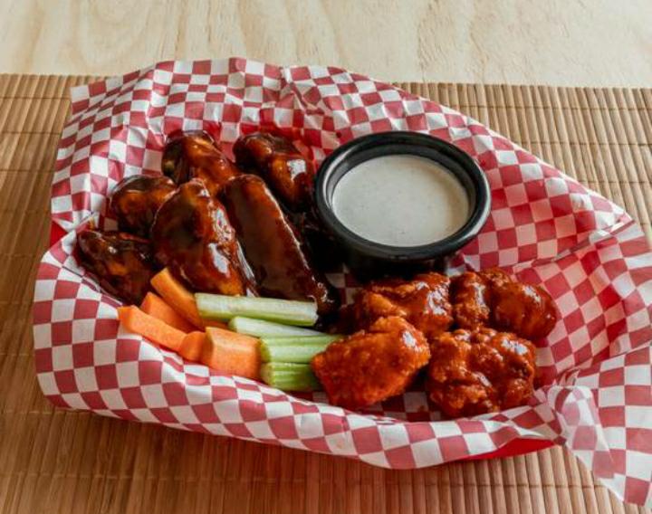 (Puedes Elegir 2 salsas ) 10 Piezas picosas: habanero, BBQ hot, chile seco, cacahuate, chipotle, piña habanero, buffalo jalapeño, buffalo, honey hot. Saladas: Limón pepper, ajo parmesano dulces: bbq, honey mustard. Incluye un aderezo de ranch.