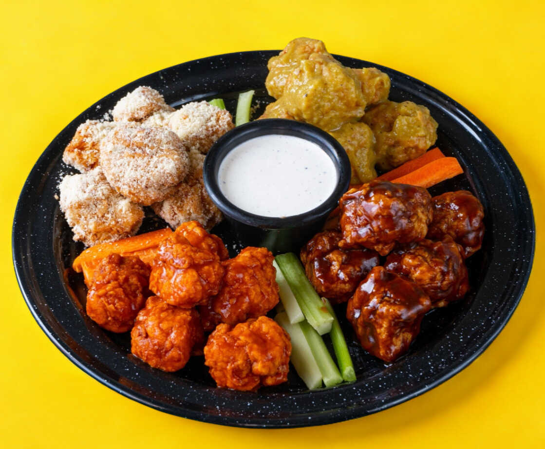 (2 salsas a elegir) Picosas: habanero, BBQ hot, chile seco, cacahuate, chipotle, piña habanero, buffalo jalapeño, buffalo, honey hot. Saladas: Limón pepper, ajo parmesano dulces: bbq, honey mustard. Incluye un aderezo de ranch.