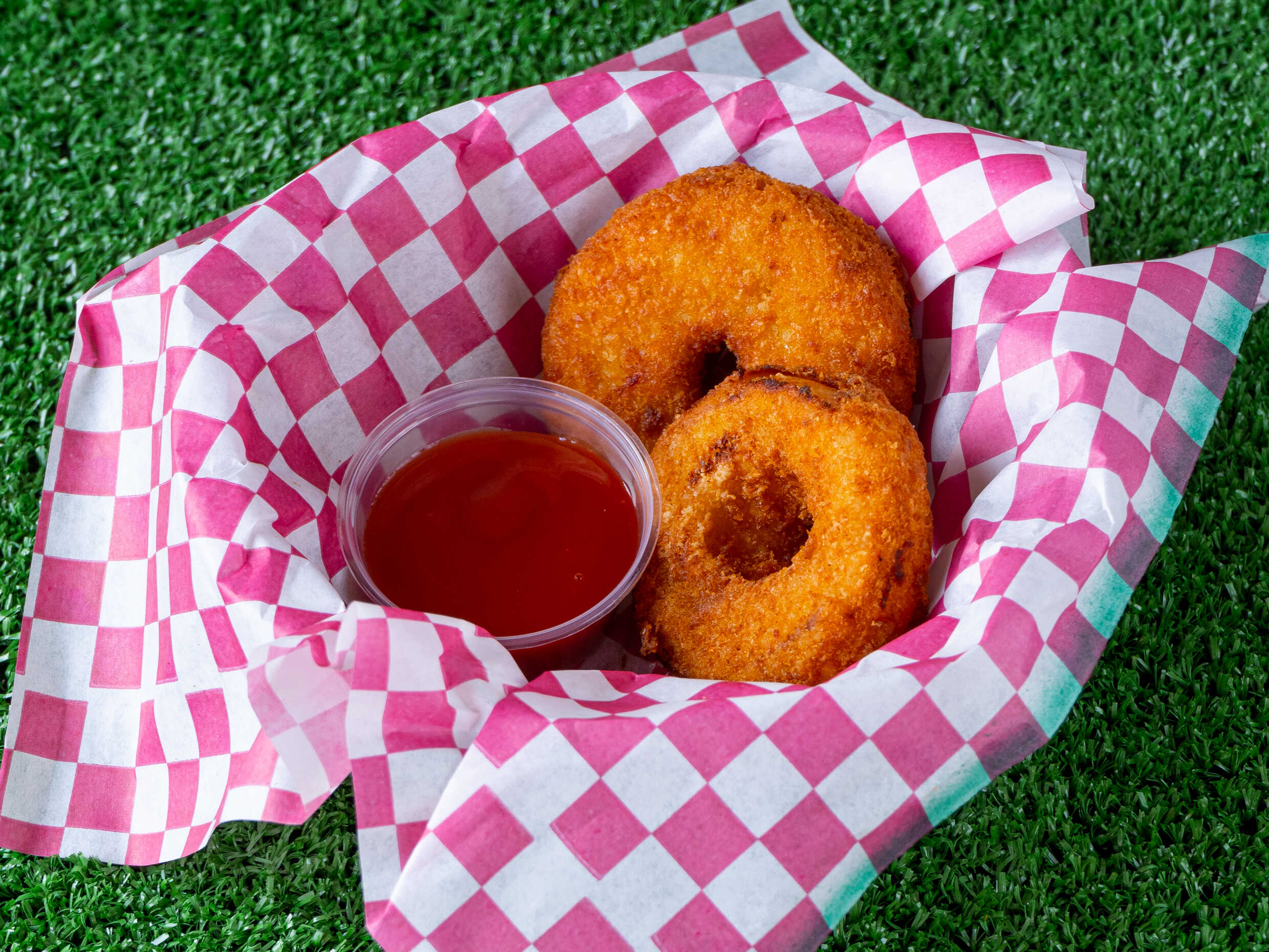 200 grs de pechuga tipo boneless, queso americano, tocino, cebolla morada,aritos de cebolla, salsa bbq, acompañada con100 grs de papas francesas y refresco de 355 ml