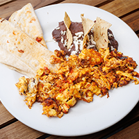 Revolvemos dos huevos a la mexicana con chilorio y acompañamos con quesadillas de tortilla de harina.