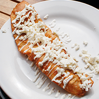 Empanada de queso con longaniza ahumada de Valladolid, crema y queso fresco.