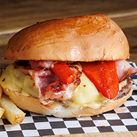 Con tocino, queso gouda y pimiento rojo asado.