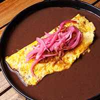 Preparamos un omelette relleno de cochinita, en un espejo de salsa de frijol coronamos con cebolla curtida.