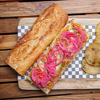 En nuestra baguette de masa madre, colocamos cochinita pibil le ponemos cebolla morada curtida, habanero y aguacate.