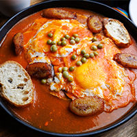 Revolvemos dos huevos, los ahogamos en salsa verde o roja, y acompañamos con longaniza ahumada de Valladolid. Acompañamos con salsa de frijol.