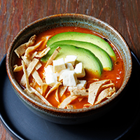 Elaboramos un caldo rojo base jitomate, epazote y chipotle. Acompañamos con crema, queso fresco, tortilla frita y aguacate.