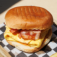 En pan brioche le ponemos tortilla de huevo con queso amarillo, tocino ahumado en leña y aderezo de chipotle.