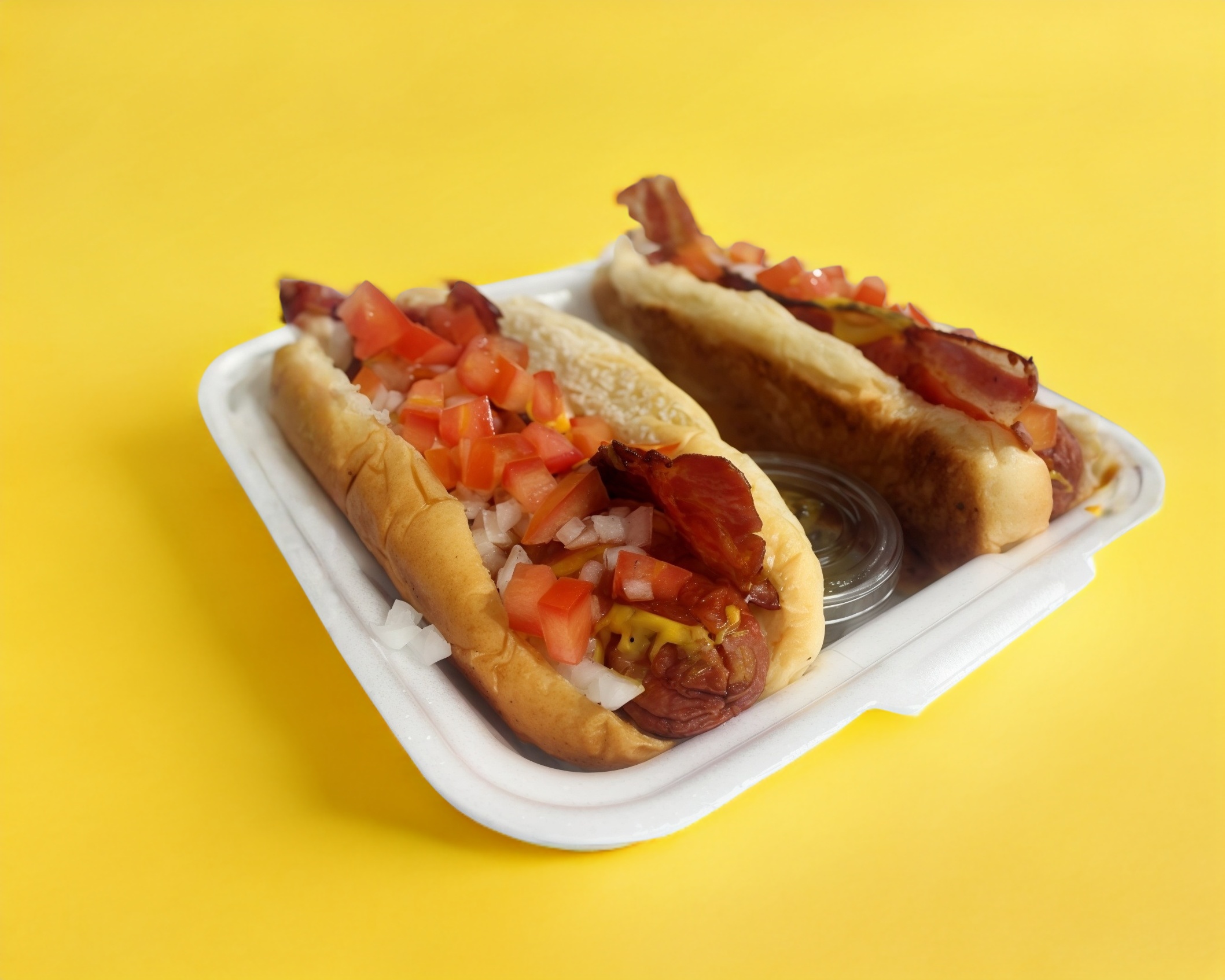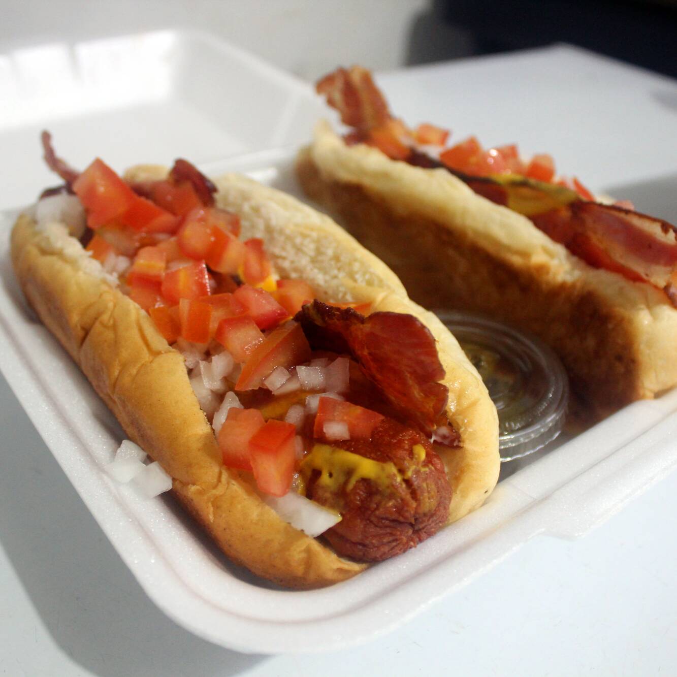 Deliciosa salchicha de pavo tamaño estándar con tocino, mayonesa, catsup, mostaza, tomate y cebolla.