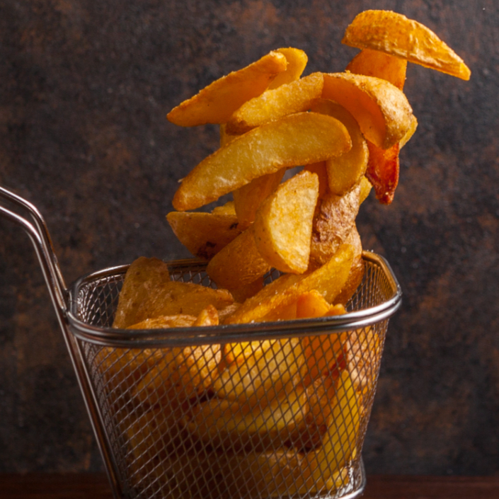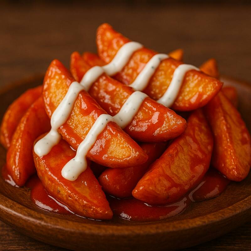Deliciosas papas gajo bañadas en salsa búfalo y queso cheddar. Incluye 1 oz. de aderezo ranch.