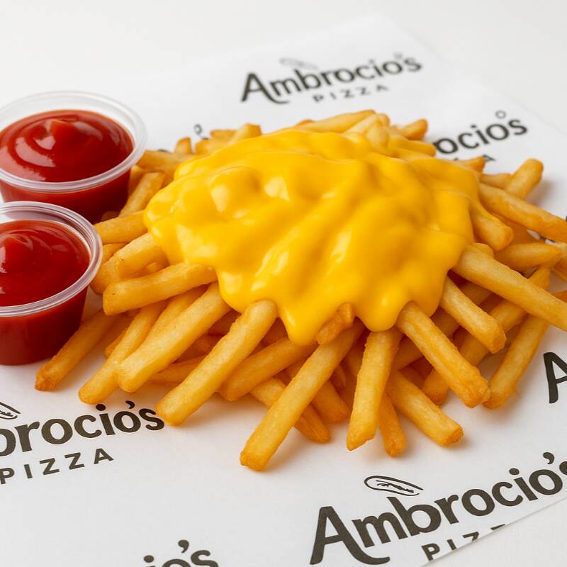 250 Gramos de papas sazonadas acompañadas de dips de queso cheddar y catsup de 2 onzas cada uno.