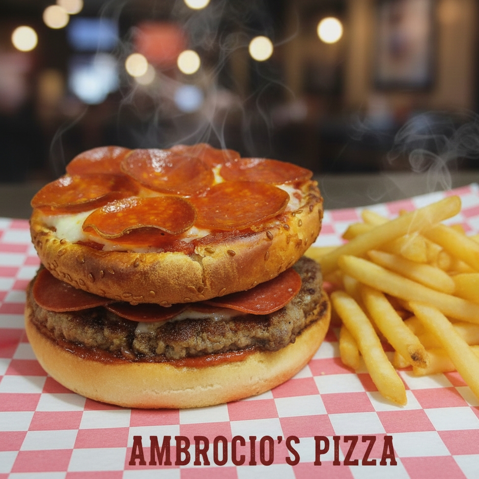 (USAMOS 100 GR DE CARNE DE RES 80/20 100% FRESCA) Pan clásico brioche, Carne de res, Queso mozzarella 100% leche de vaca, Salsa de pizza, Pepperoni,. Queso parmesano, 100 grs. de papas a la francesa.