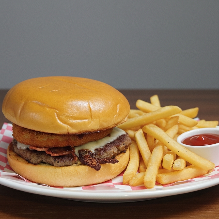 Pan brioche, carne de res, tocino, queso mozzarella, aros de cebolla BBQ, 100 grs. de papas a la francesa.